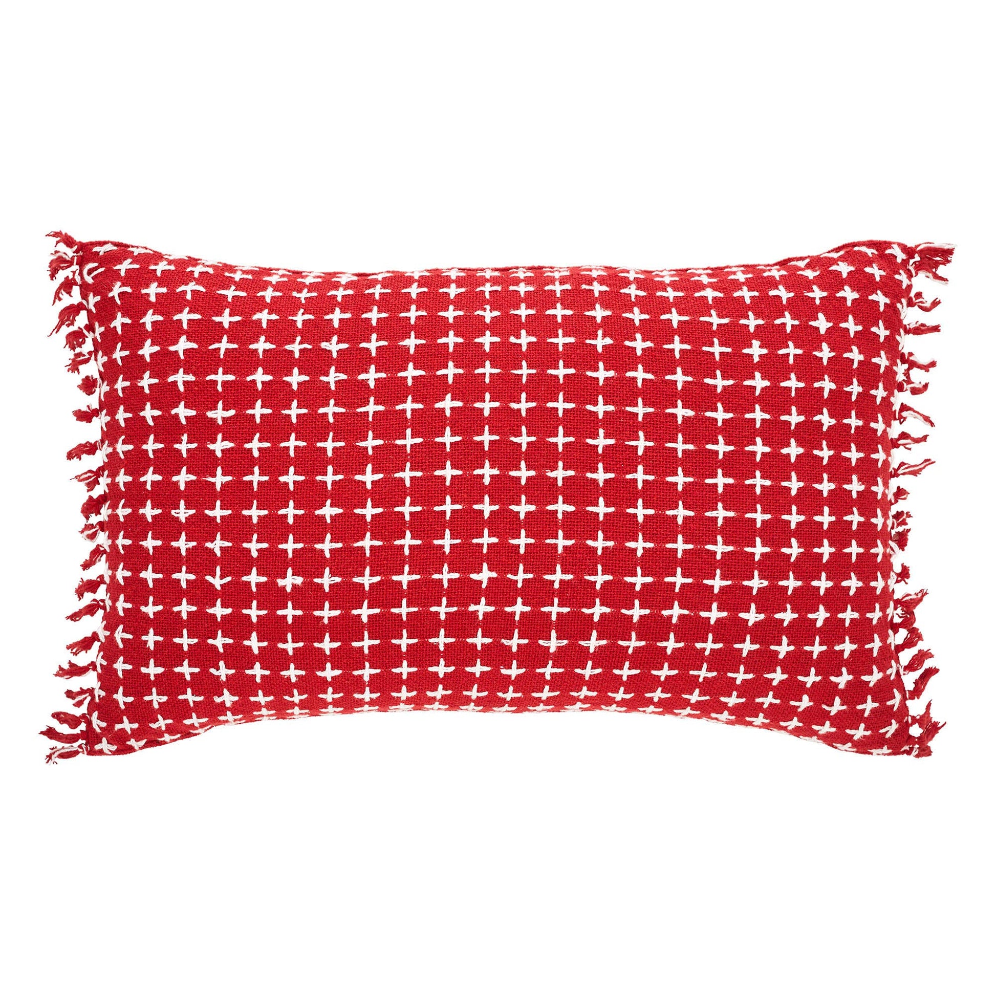 Add a little pop of festive style with this Christmas accent pillow. The Gallen Red White Fringed Pillow. The filled pillow features a deep red base with a simple white stitched pattern woven on the front. The cozy red accent pillow includes dramatic tasseled edging.