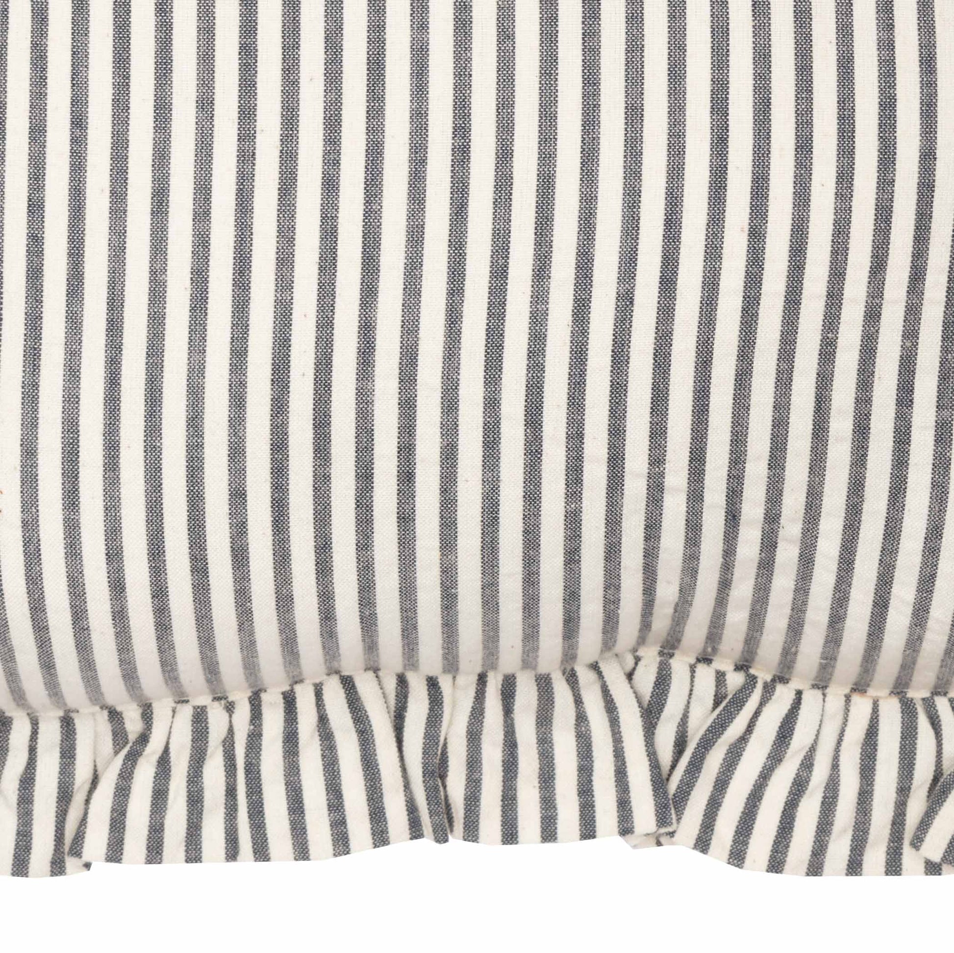 Showcase your casual style and patriotic spirit with the Hatteras Seersucker Blue Ticking Stripe Pillow. Measuring 12x12 inches, this charming accent features classic blue and white stripes with a softly ruffled edge for a touch of farmhouse elegance. The reverse mirrors the same seersucker fabric, offering a cohesive look from every angle. Perfect for layering on a sofa, bed, entryway bench, or rocking chair, this decorative pillow pairs beautifully with the Hatteras Collection to create a relaxed, country-inspired home.