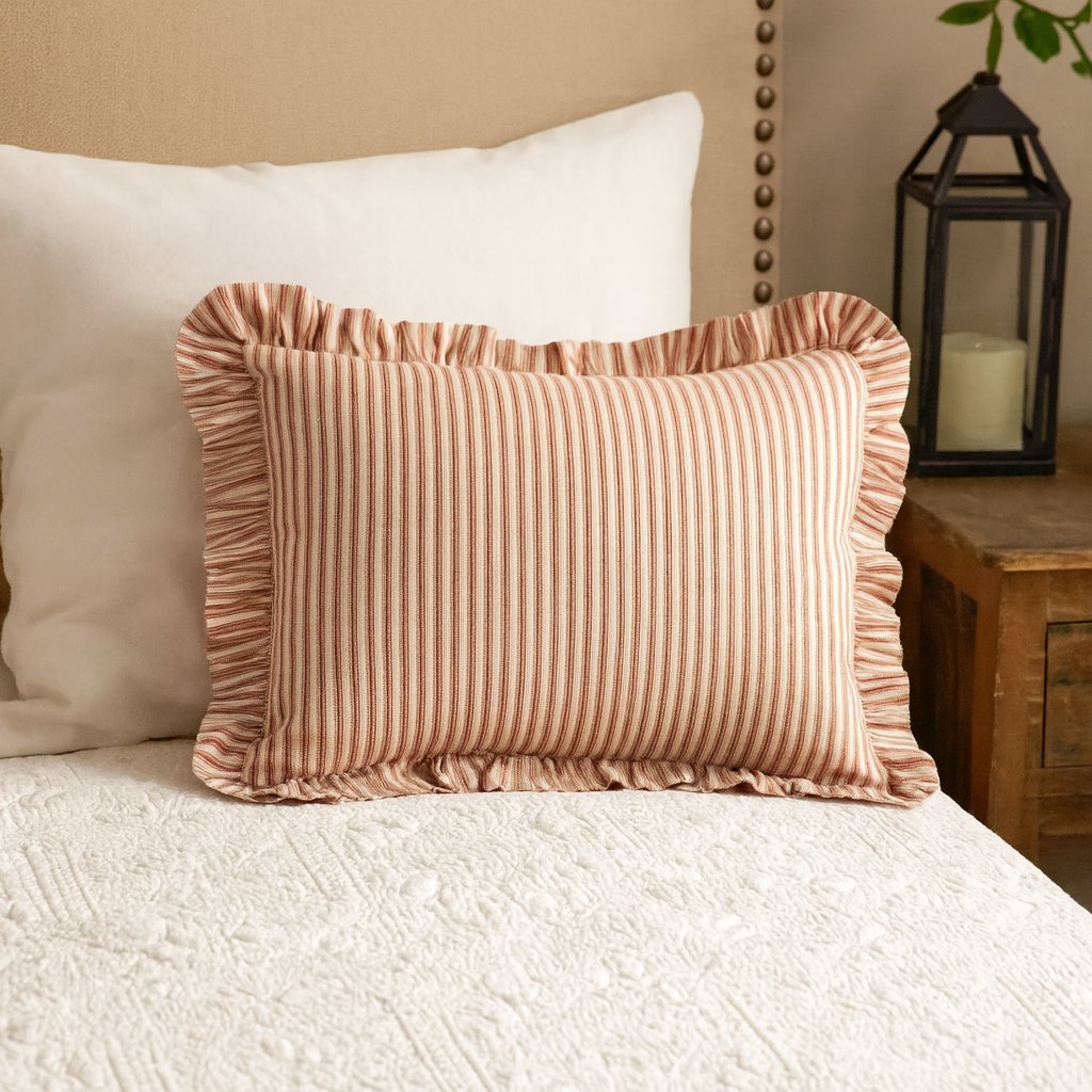 Bring timeless farmhouse style into your home with the Sawyer Mill Red Ticking Stripe Pillow. This charming accent piece features a classic country red and deep crème striped pattern on both the front and back for a cohesive look. Button-style closures add a touch of rustic detail while ensuring effortless use, and the soft ruffled edging gives it a cozy, vintage-inspired finish. Perfect on its own or paired with other pieces from the Sawyer Mill Red Collection, this pillow is an inviting accent that completes any country farmhouse space.