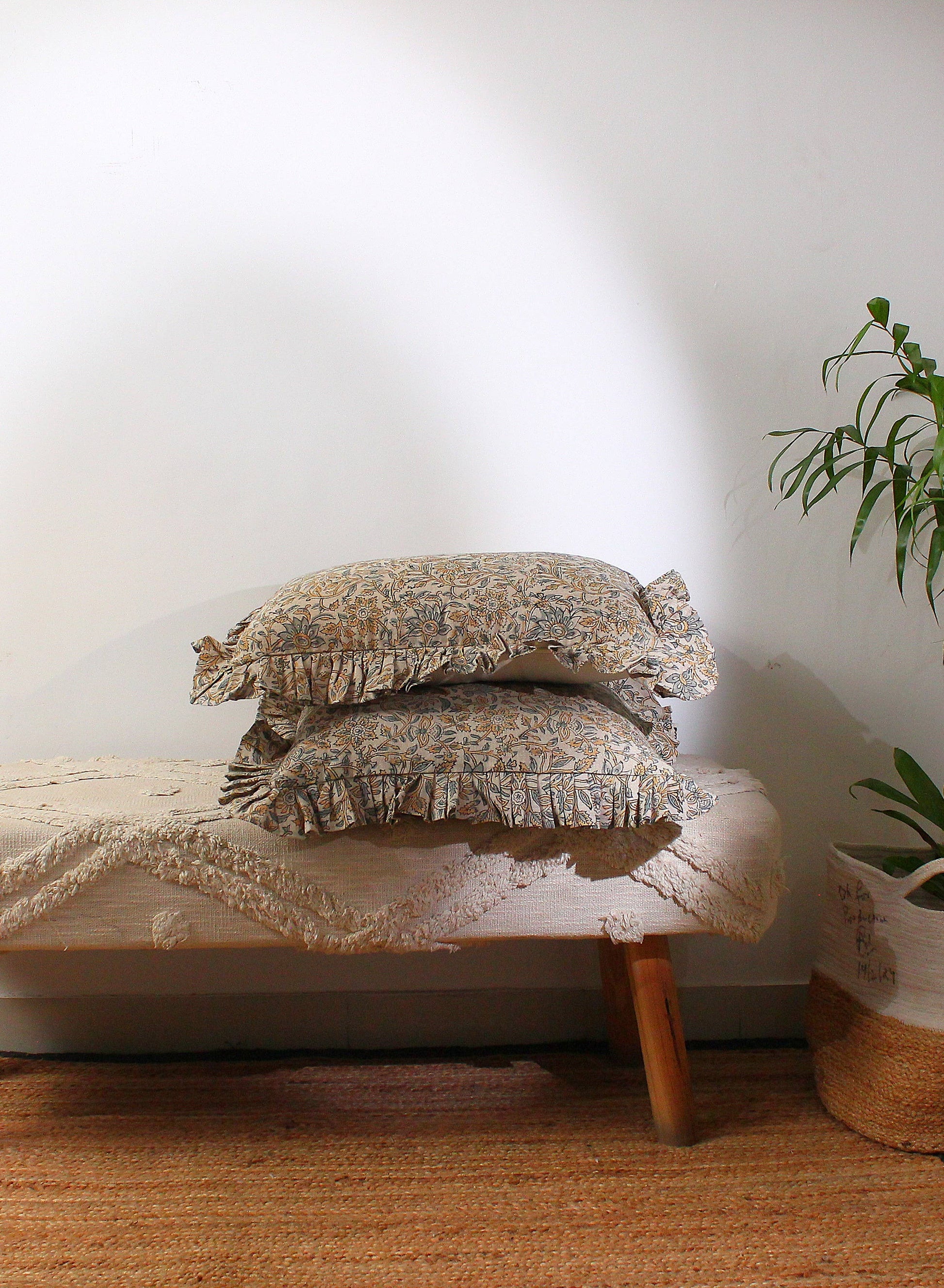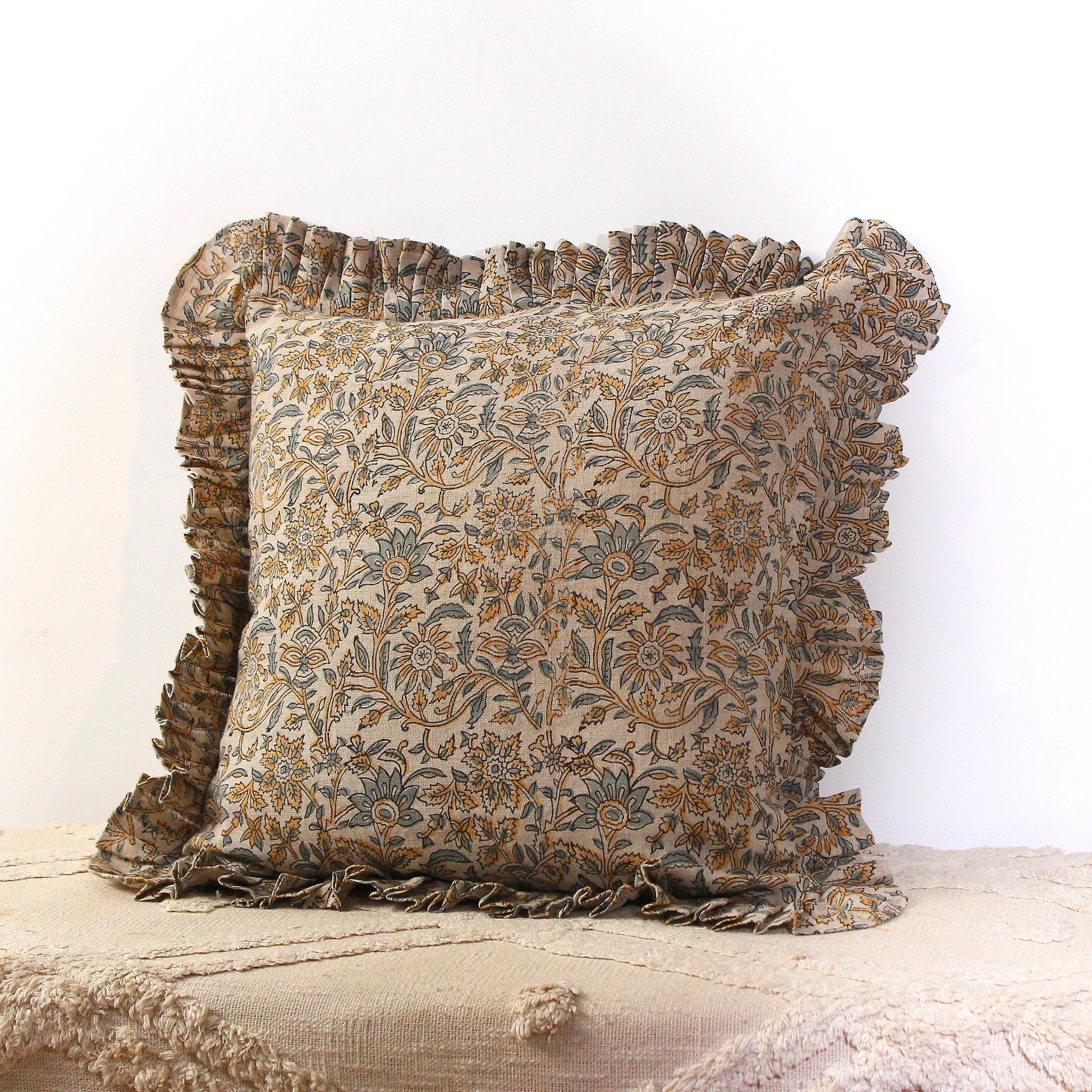 Infuse your home with the timeless beauty of handcrafted design. Our Floral Hand Block Printed Linen Pillow is made by skilled artisans using traditional block-printing techniques. The intricate floral motifs in soft apricot and muted blue tones bring a touch of warmth and organic elegance to any space. Finished with delicate ruffled edges, this piece adds texture, charm, and artisanal character to your living room or bedroom décor.